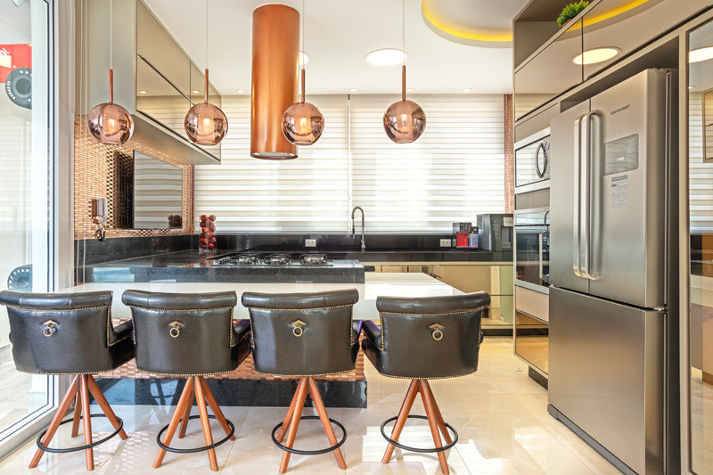 Contemporânea e funcional. Essas são as características que definem a cozinha da Casa Olivito, Uma porta de correr separa esse ambiente da sala de jantar. Se a porta estiver aberta, todos os espaços ficam integrados. Destaque para a coifa – da Design Coifas – e os pendentes da bancada na cor cobre, que conferem requinte a este projeto de interiores.