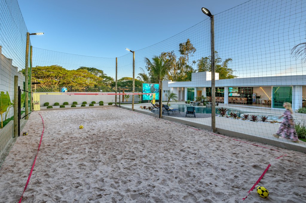 Na Chácara Paradise, ao lado da piscina, uma grande quadra de beach tennis e futevôlei é pura diversão para quem adora praticar esportes. Também foram projetados dois vestiários, o feminino – em vermelho e branco – e o masculino – em branco e azul. A área gourmet é um grande salão de festas e conta com um enorme e sinuosos balcão de trabalho, chopeira dupla, fogão, churrasqueira, mesas de refeição e jogos e um lounge voltado para a piscina e também para a TV. A noite, um equipamento eletrônico embutido no teto do gourmet, transforma o espaço em uma grande balada.