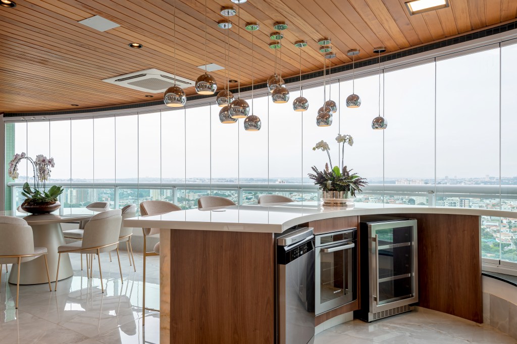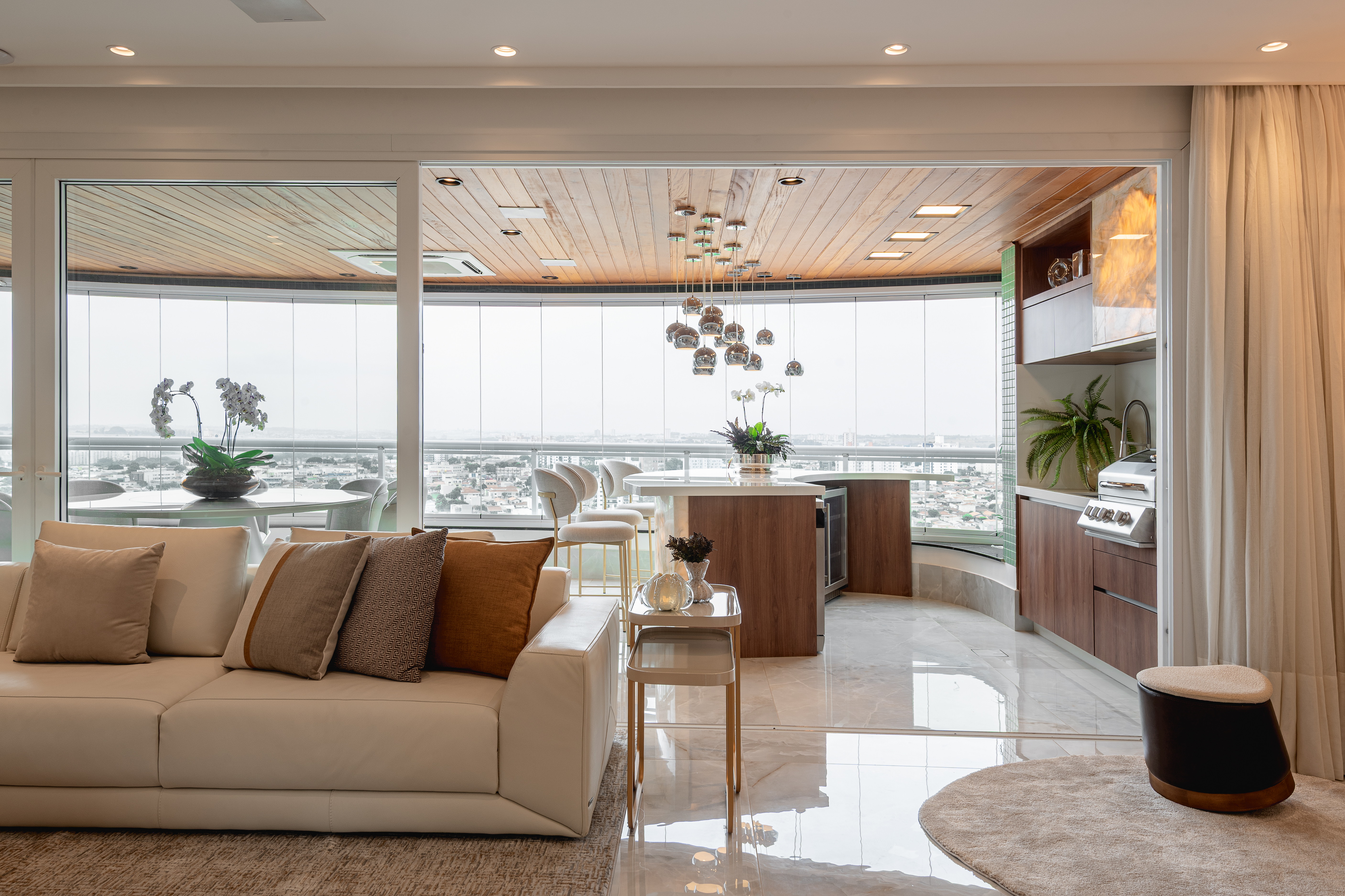 O Apartamento Wases, um duplex de 472m², com design de interiores assinada pela designer Iara Kílaris, tem decoração clean e contemporânea e duas áreas gourmet. No primeiro andar estão living e TV com sala de leitura integrada e uma varanda gourmet completa, com mesas, churrasqueira e bancada de refeições.