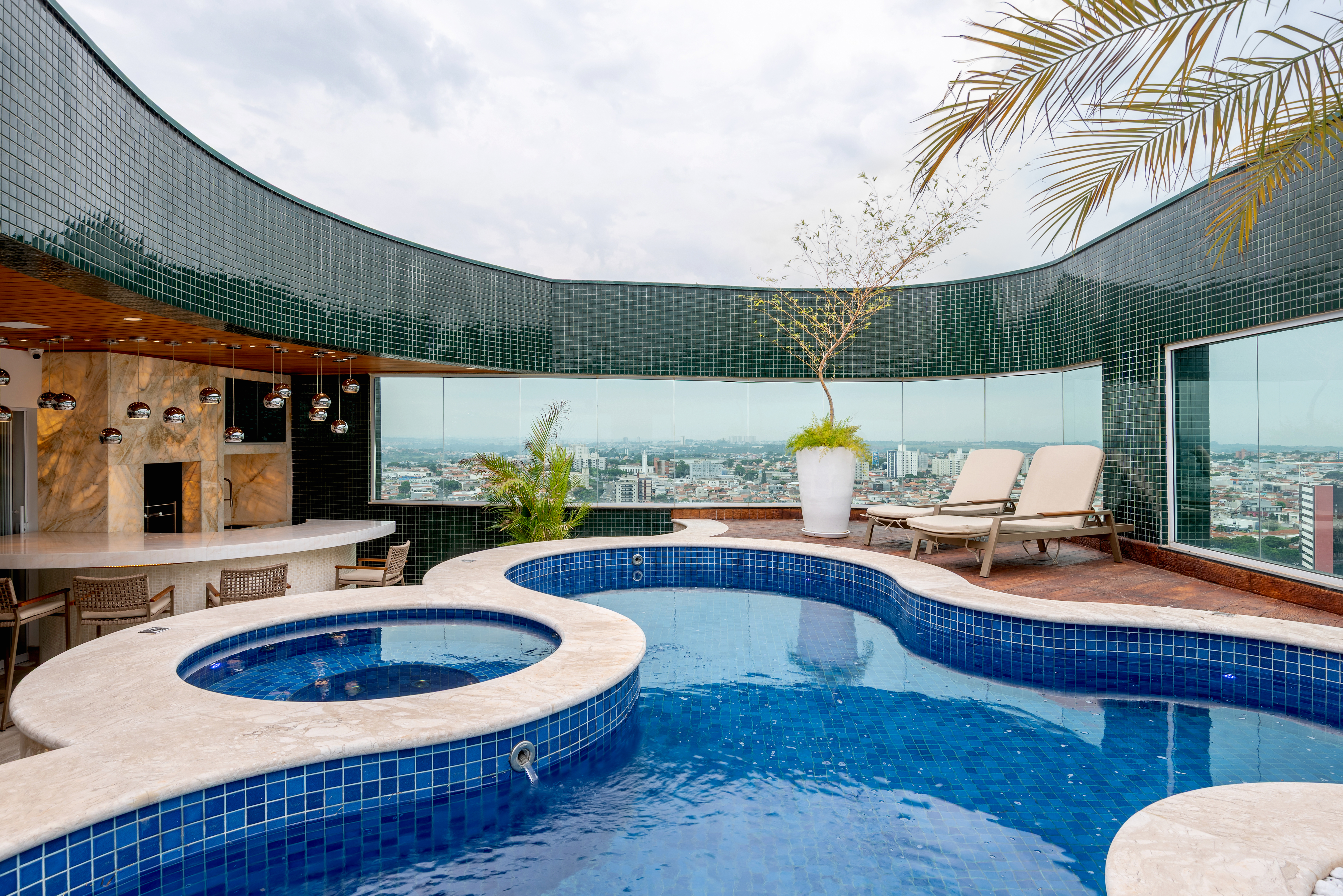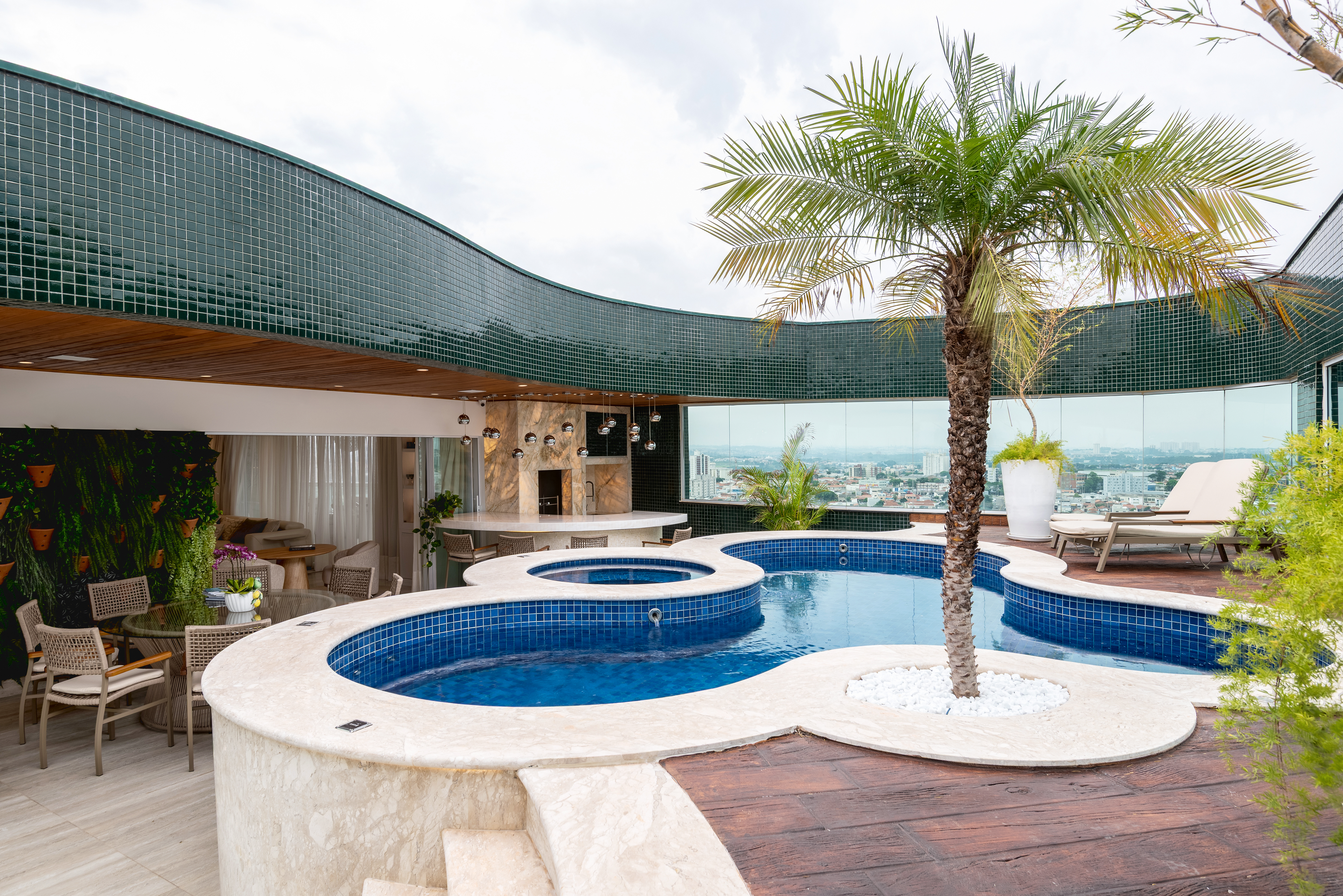 No apartamento Wases, um duplex com 472m², a piscina em forma orgânica, bem ao “Estilo Kílaris”, está localizada na área de lazer da cobertura, voltada para uma vista de tirar o fôlego. A área de lazer conta também com um goumert completo, varanda com mesas para refeição e espaços para banhos de sol e contemplação.