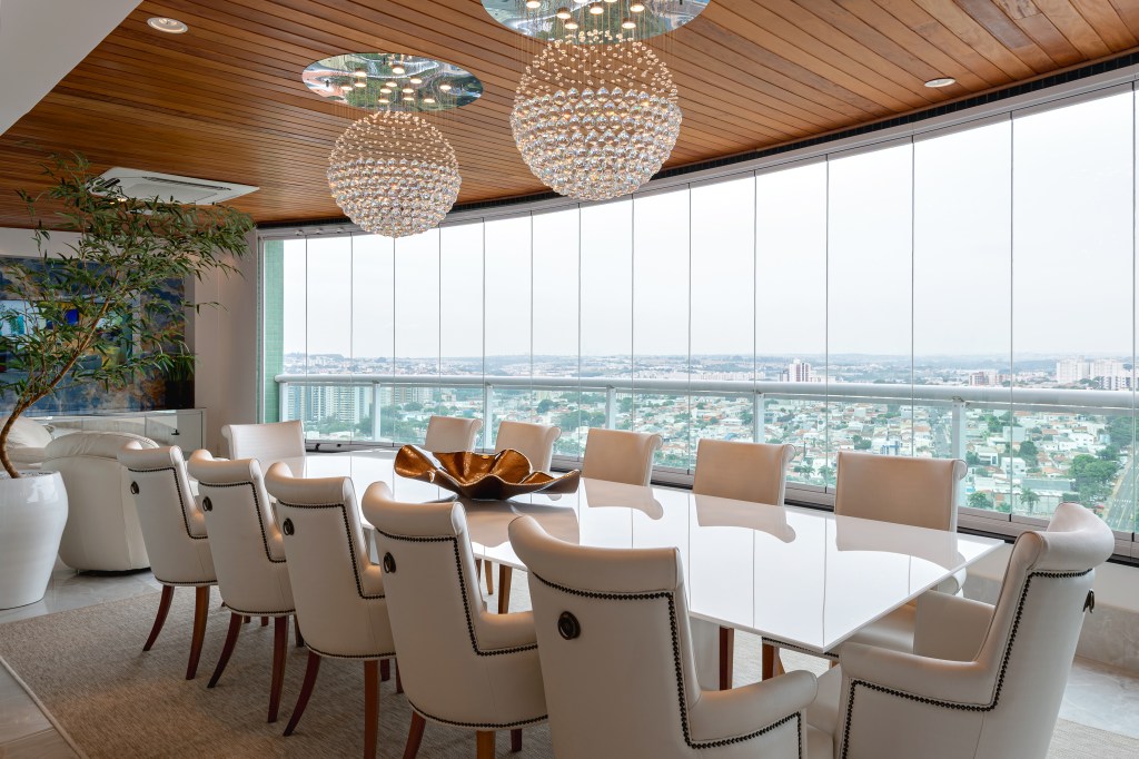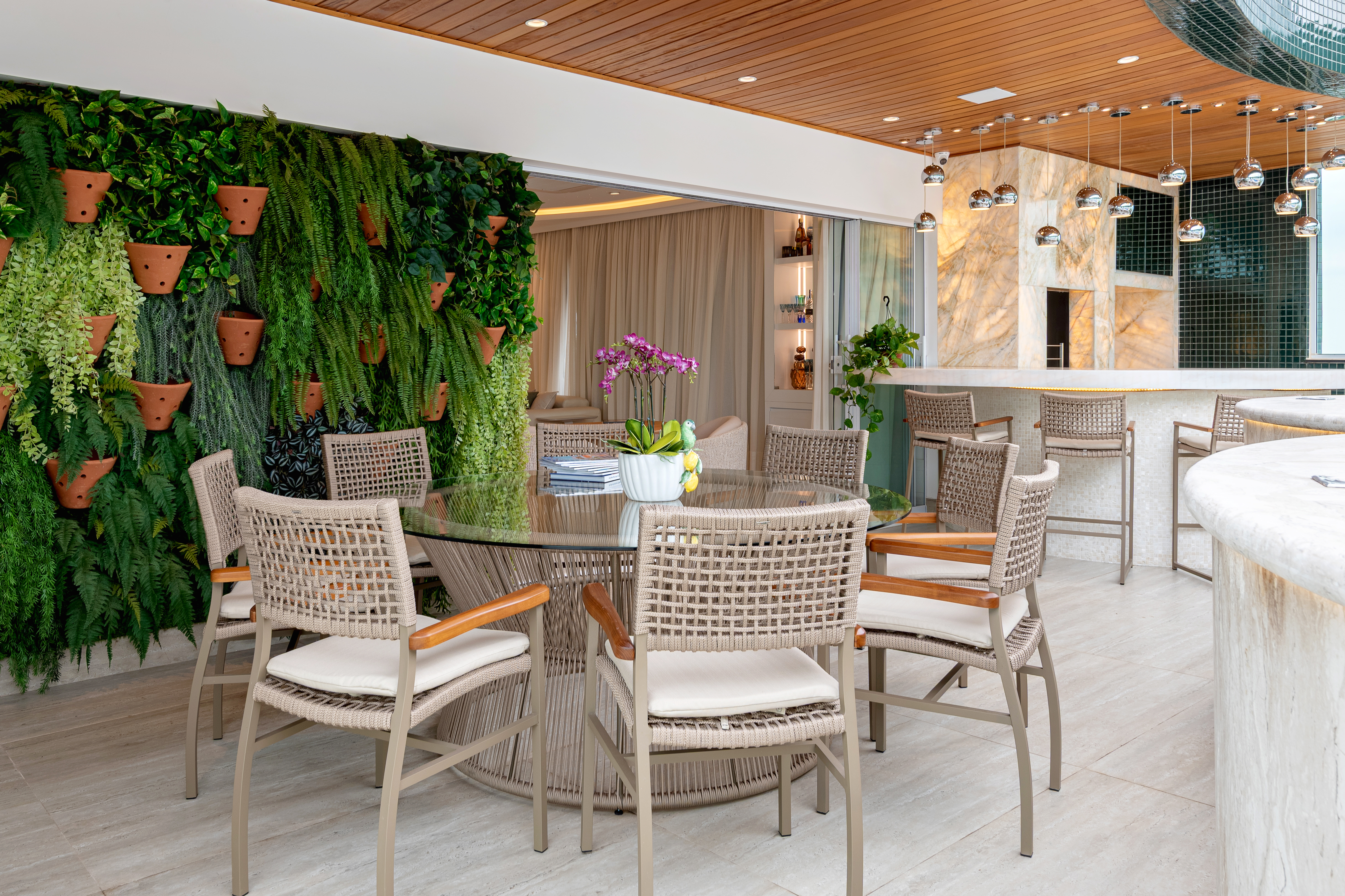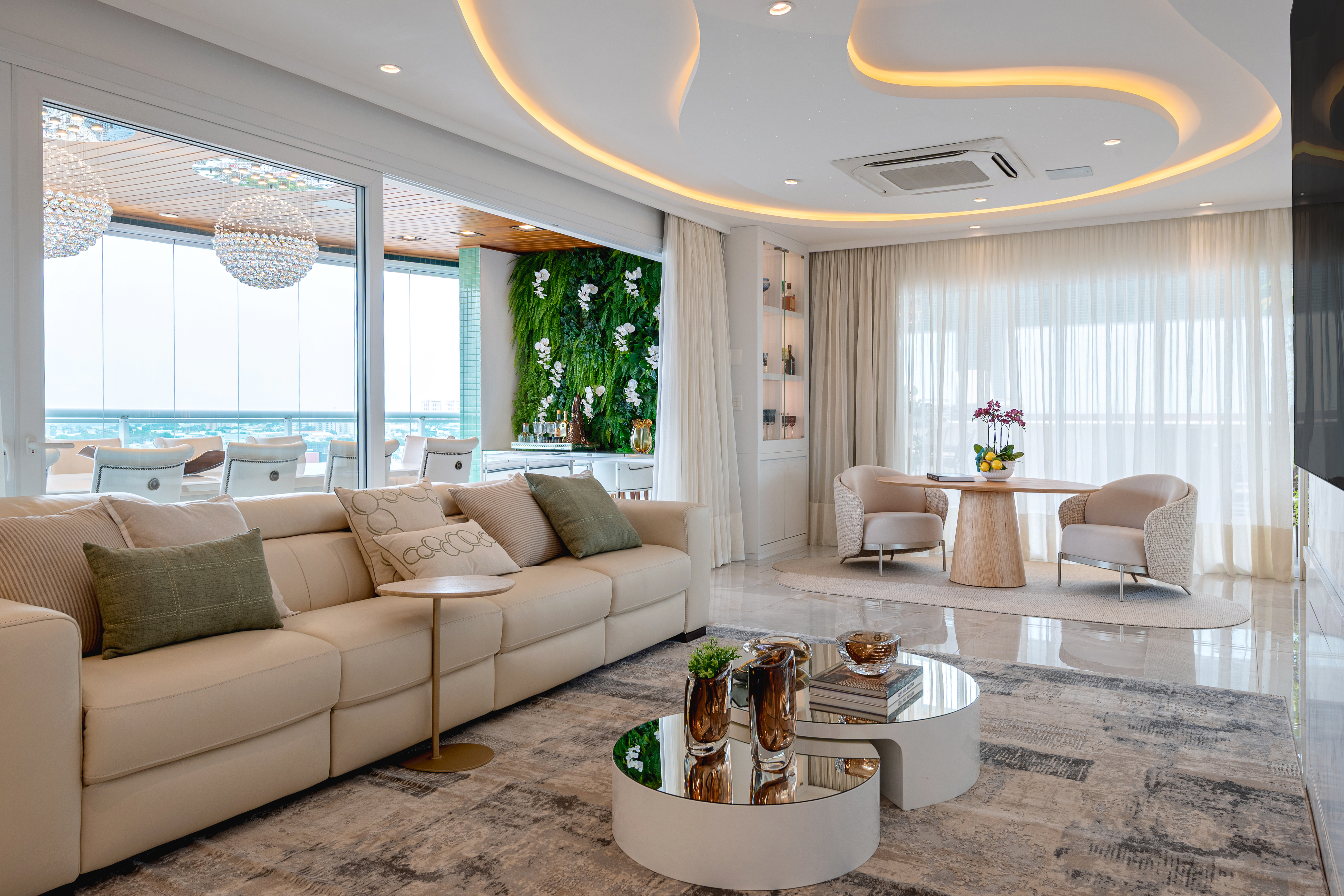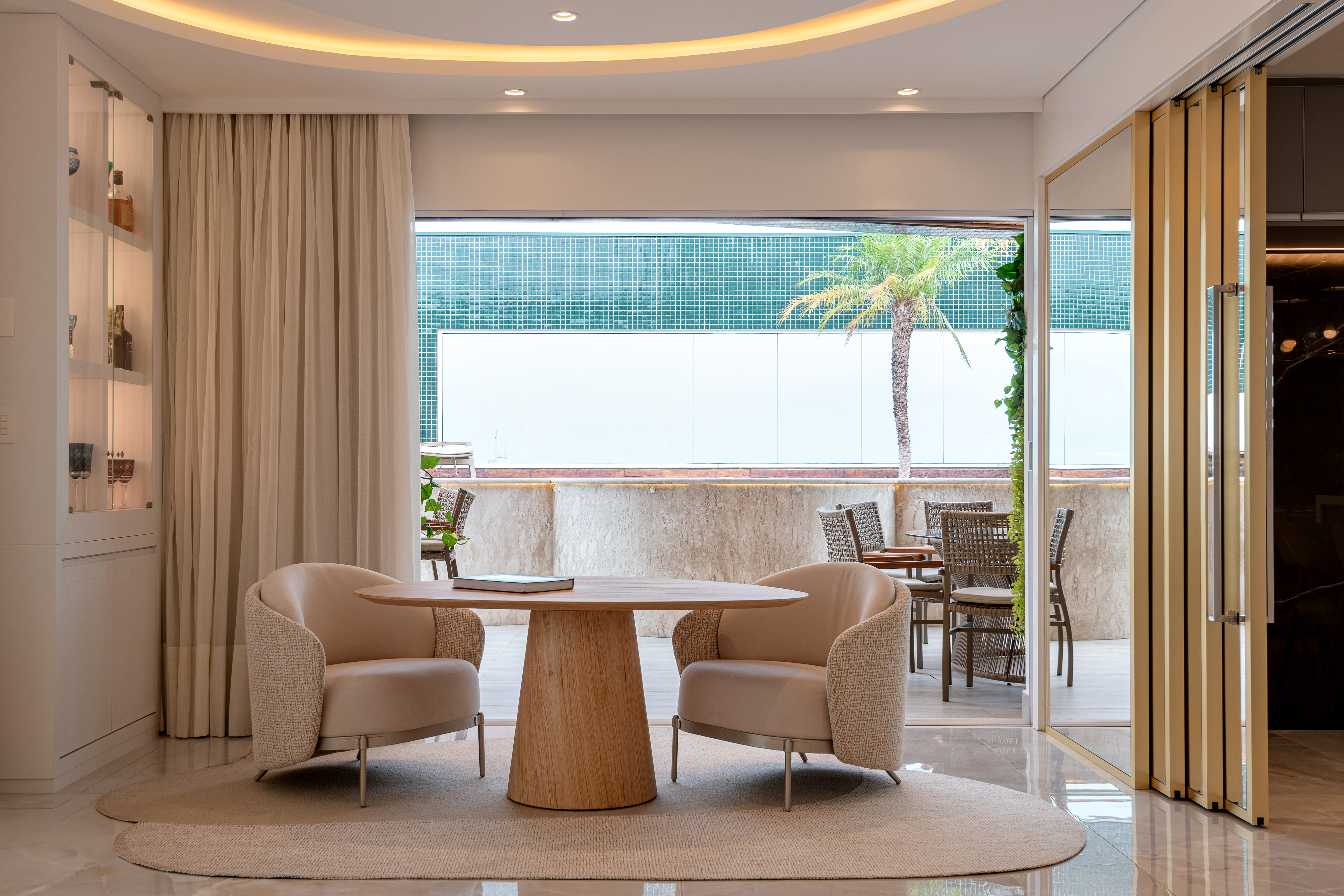 O duplex de 472m², com design de interiores assinada pela designer Iara Kílaris, tem decoração clean e contemporânea e duas áreas gourmet. No primeiro andar estão living e TV com sala de leitura integrada e uma varanda gourmet completa, com mesas, churrasqueira e bancada de refeições.