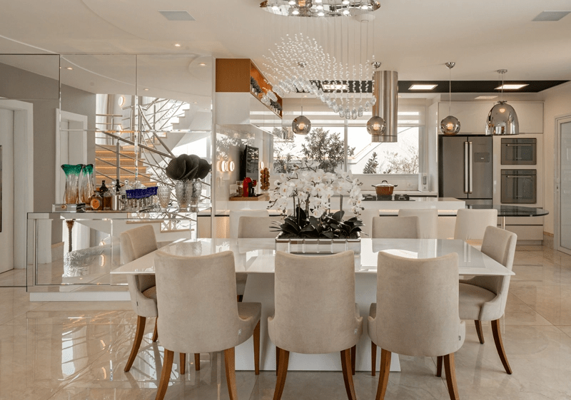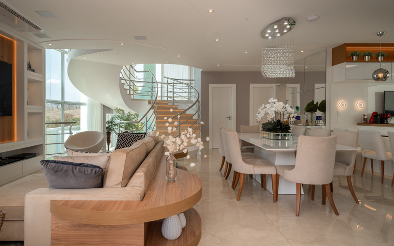 No segundo platô, a marca é a integração dos ambientes sociais: sala de jantar, sala de tv, cozinha aberta e toda a área de lazer. O grande painel de espelho, quando aberto, revela o escritório. Neste pavimento também temos a piscina em formas orgânicas, spa, prainha, espaço gourmet com churrasqueira argentina, balcão, cantinhos de relaxamento e vestiário.