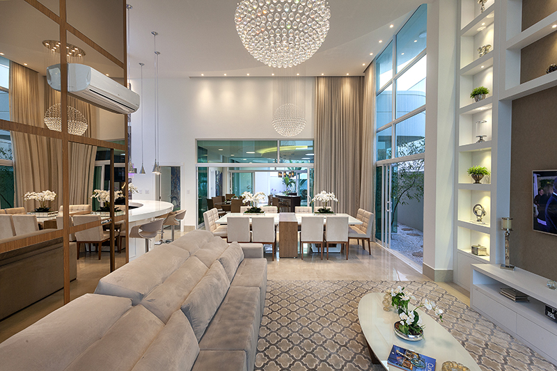 amplos e com várias funções. O living, com pé duplo e decoração nas paredes,