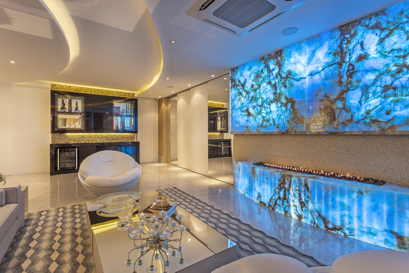 Ele se estende como guarda corpo pelo mezanino que possui uma belíssima lareira revestida com pedra Sal Blue translúcida retro iluminada. Este mezanino faz a distribuição para as três suítes principais e ao quarto de hóspedes e escritório, que usam banheiro compartilhado.
