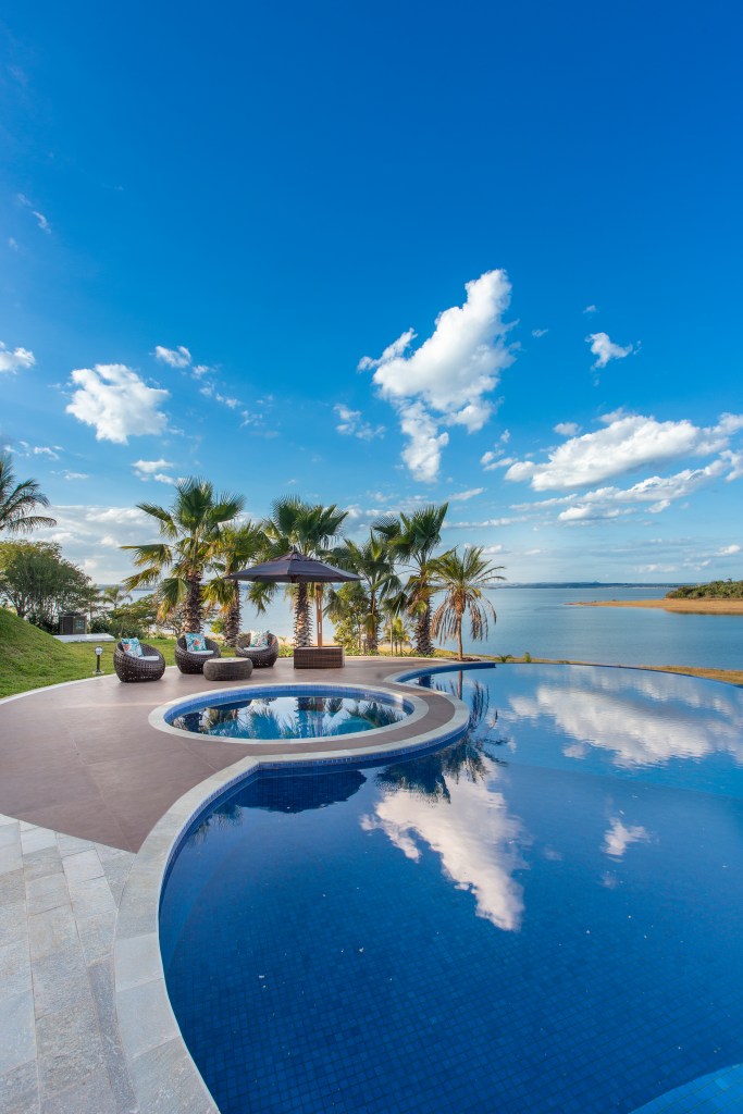Foi exatamente este o caso do projeto Casa Avaré, assinado pelo arquiteto Aquiles Nícolas Kílaris. A piscina, que ocupa um espaço de 180,57m² de área, foi idealizada com borda infinita. Suas águas “se misturam” com as da represa, em um visual deslumbrante de tirar o fôlego.