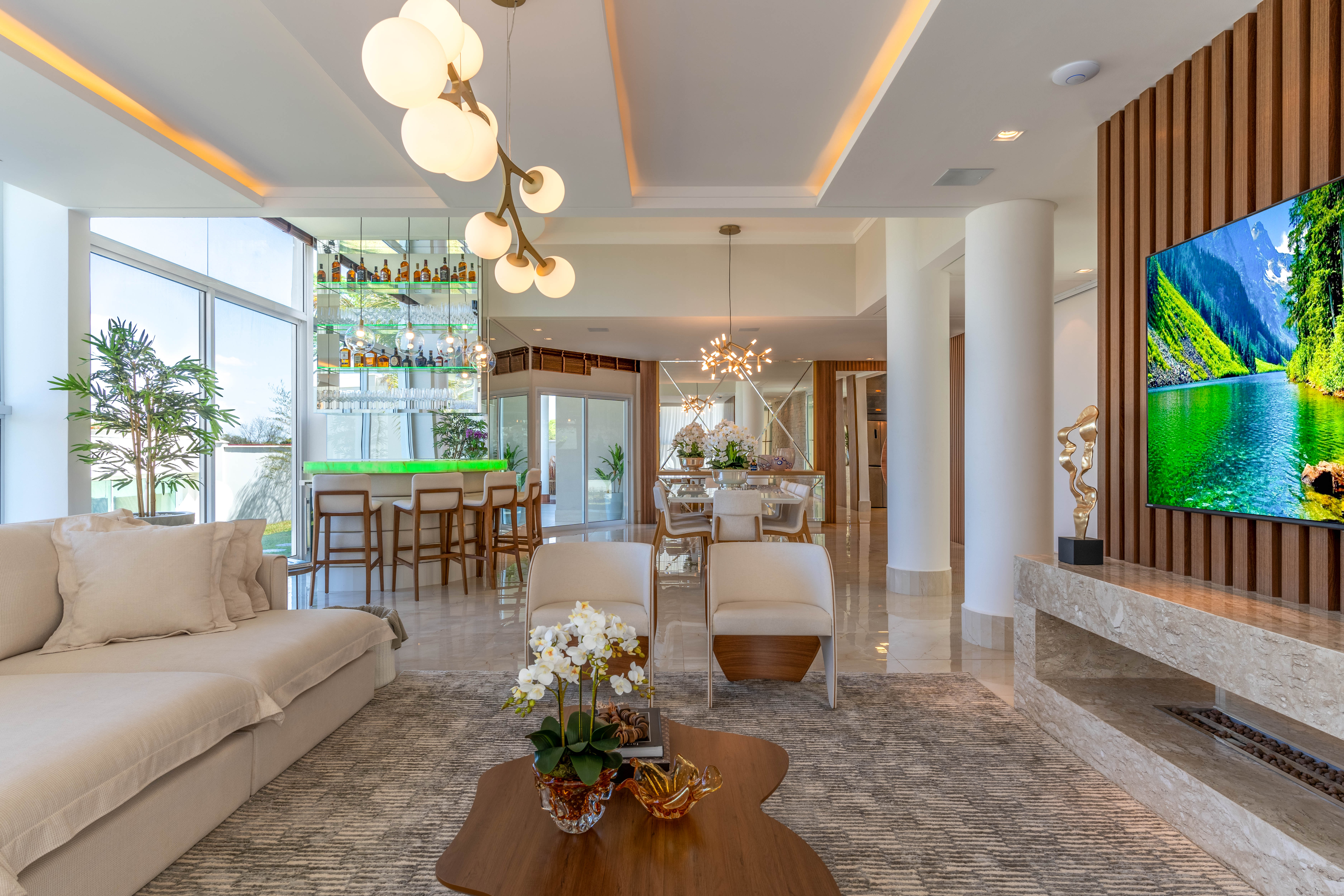 A área de lazer começa com um grande pergolado de convivência e descanso. Mesas e poltronas. A estrela do lazer é a piscina com efeito de areia em formato orgânico que remete a praia e sua bela cascata de pedras com plantas naturais que aumentam a sensação de estar de bem-estar. Um grande telão na ponta da piscina completa o cenário.