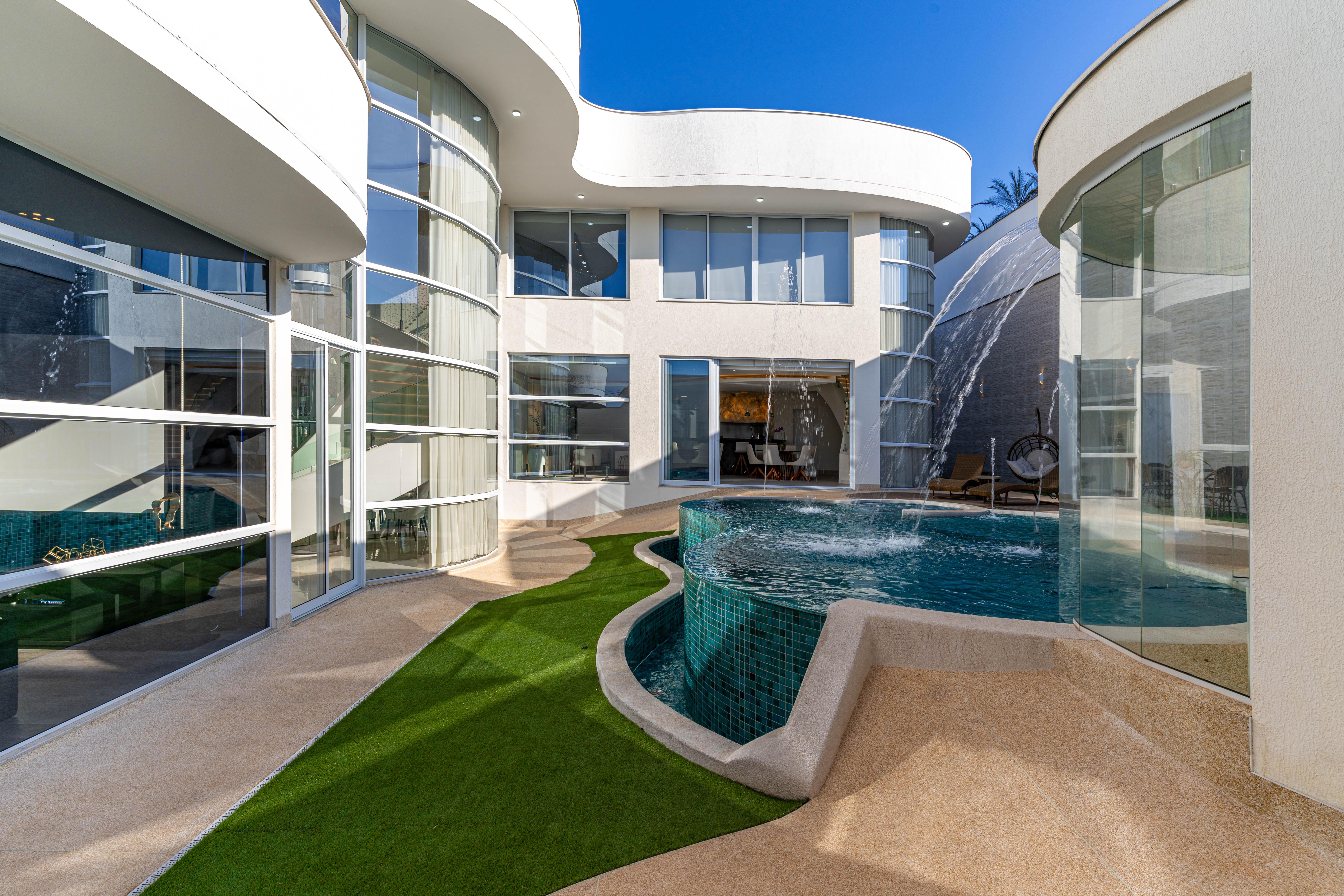 A integração de ambientes é outra forte característica, unindo living, sala de jantar, bar. Um grande painel de espelho, quando aberto, proporciona a integração destes espaços com a sala de cinema e o home office, ambientado no universo do futebol. Na cozinha contemporânea, com ilha de cocção e sala de almoço, privilegiam a interação entre o “chef” e seus convidados