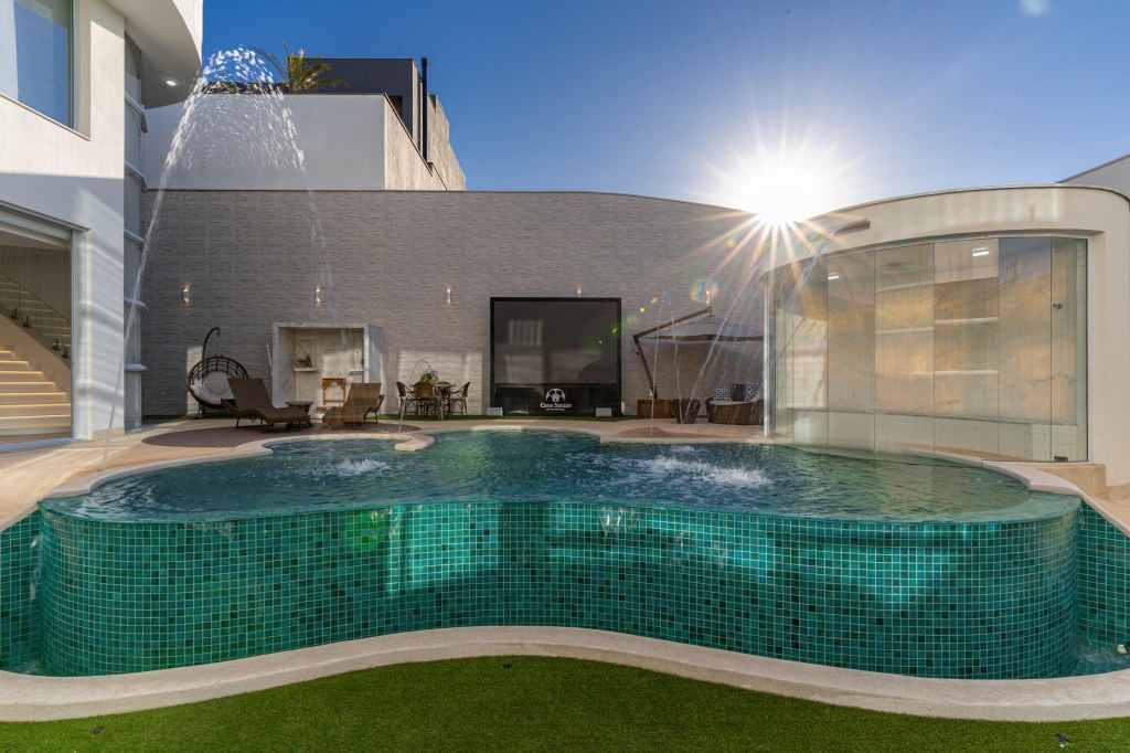 Apesar de integrado, o complexo de lazer da Casa Aspen, assinada pelo arquiteto Aquiles Nícolas Kílaris, foi acomodado em um nível acima no terreno. Com estrutura completa ele funciona independente do andamento da casa. Neste espaço foi projetado gourmet completo, piscina em formato orgânico com borda infinita, sauna envidraçada, cantos de relaxamento, banho de sol e um grande telão. O segundo andar do complexo tem sala de jogos, academia sala de TV e quarto de hóspedes.