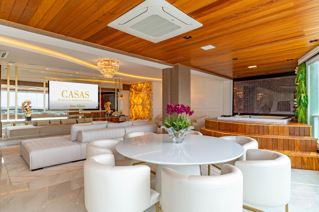 Para o planejamento de interiores do Apartamento Waves, o proprietário que é antigo cliente do escritório, desejava ambientes sociais integrados, contemporâneos e funcionais. Por esse motivo, as portas de saída para a varanda foram retiradas, criando um espaço único entre o living, gourmet, sala de jantar, sala de almoço e cozinha. A vista da cidade de Americana é cenário para todo essa área.