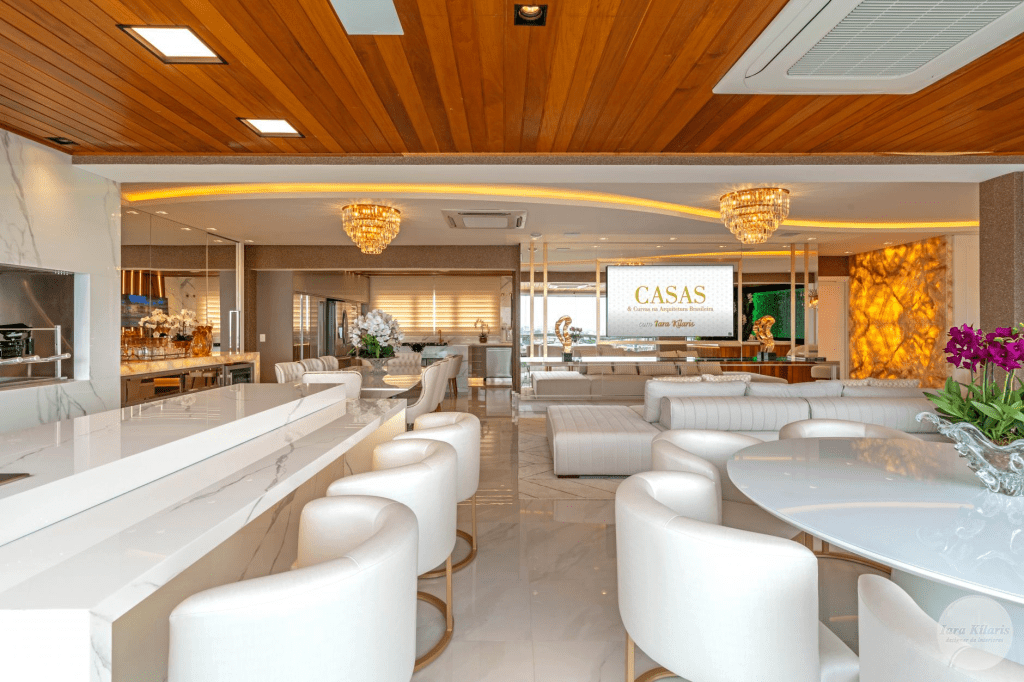 Para aumentar ainda mais a sensação de amplitude no Apartamento Waves, assinado pela designer Iara Kílaris, foram usados muitos painéis de espelhos, que refletem todo o entorno e a luz natural abundante. O gourmet completo, com fogão, churrasqueira, mesa e bancada de refeições, ganhou ainda um spa, no alto de um deck de madeira, com parede verde e de cromoterapia. No lavabo, iluminação com teto de cristais e bancada curva com linhas e formas gregas.