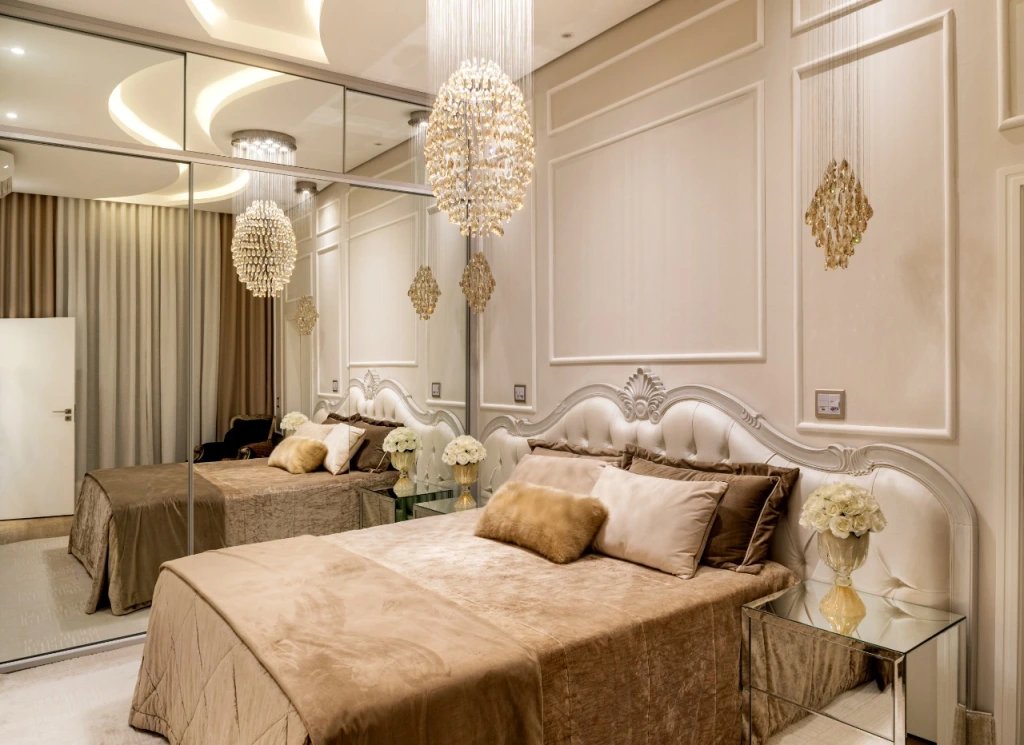 A cabeceira branca , que vai de fora a fora abraçando a cama e as duas cômodas, concebe imponência ao ambiente. Os frisos da parede são elementos elegantes e com ótimo custo-benefício, já que são feitos de gesso. Na luminotécnica lustre central e pendentes de cristais complementam o espaço.
