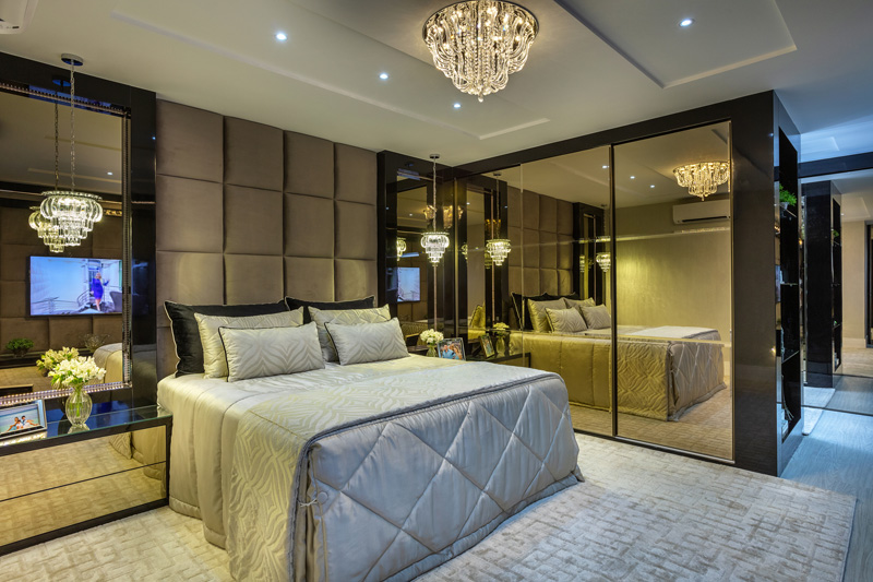 A máster, toda em tons de bege, foi concebida com sala de banho e um espaçoso closet. A luminotécnica é composta por pendentes de cristais na lateral da cama e um lustre central de teto. Espelhos foram usados padra dar maior sensação de amplitude.