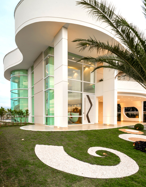 A Casa De La Torre, assinada pelo arquiteto Aquiles Nícolas Kílaris, foi concebida com fachadas sinuosas e linhas curvas que abraçam toda a estrutura da residência. O pé direito altíssimo confere imponência ao imóvel localizado em Porto Feliz, no interior de São Paulo. A fachada lateral, toda em pano de vidro, integra espaços internos e externos e confere iluminação natural abundante. O proprietário, um peruano que veio ao Brasil com 18 anos, hoje é importador e exportador de produtos automotivos e ainda conserva seu amor pelas tradições de seu país.