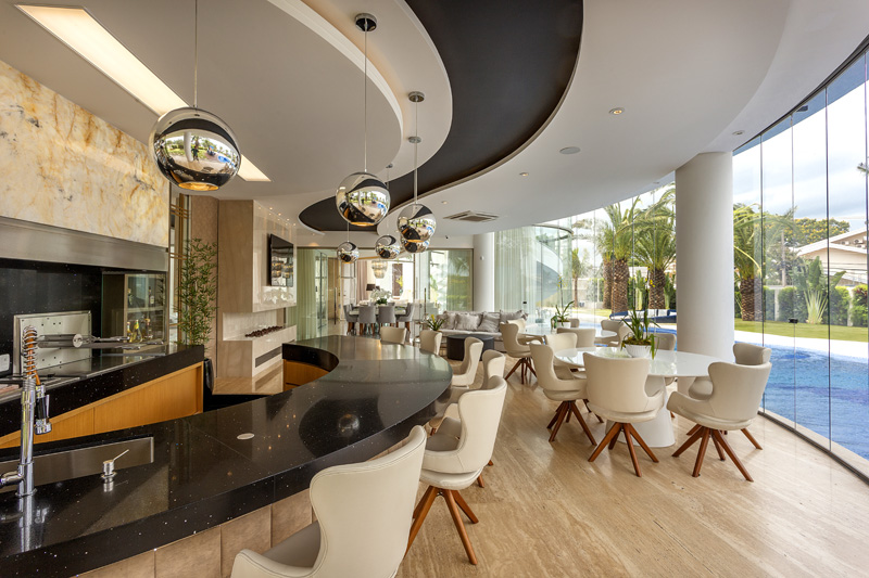 O espaço gourmet da Casa Cristal, assinada pelo arquiteto Aquiles Nícolas Kílaris é imponente e completo para receber com conforto amigos e parentes. O balcão rebaixado aumenta a interatividade social. O espaço gourmet é o eixo de várias conexões, dando acesso às áreas social, de serviços e de lazer.