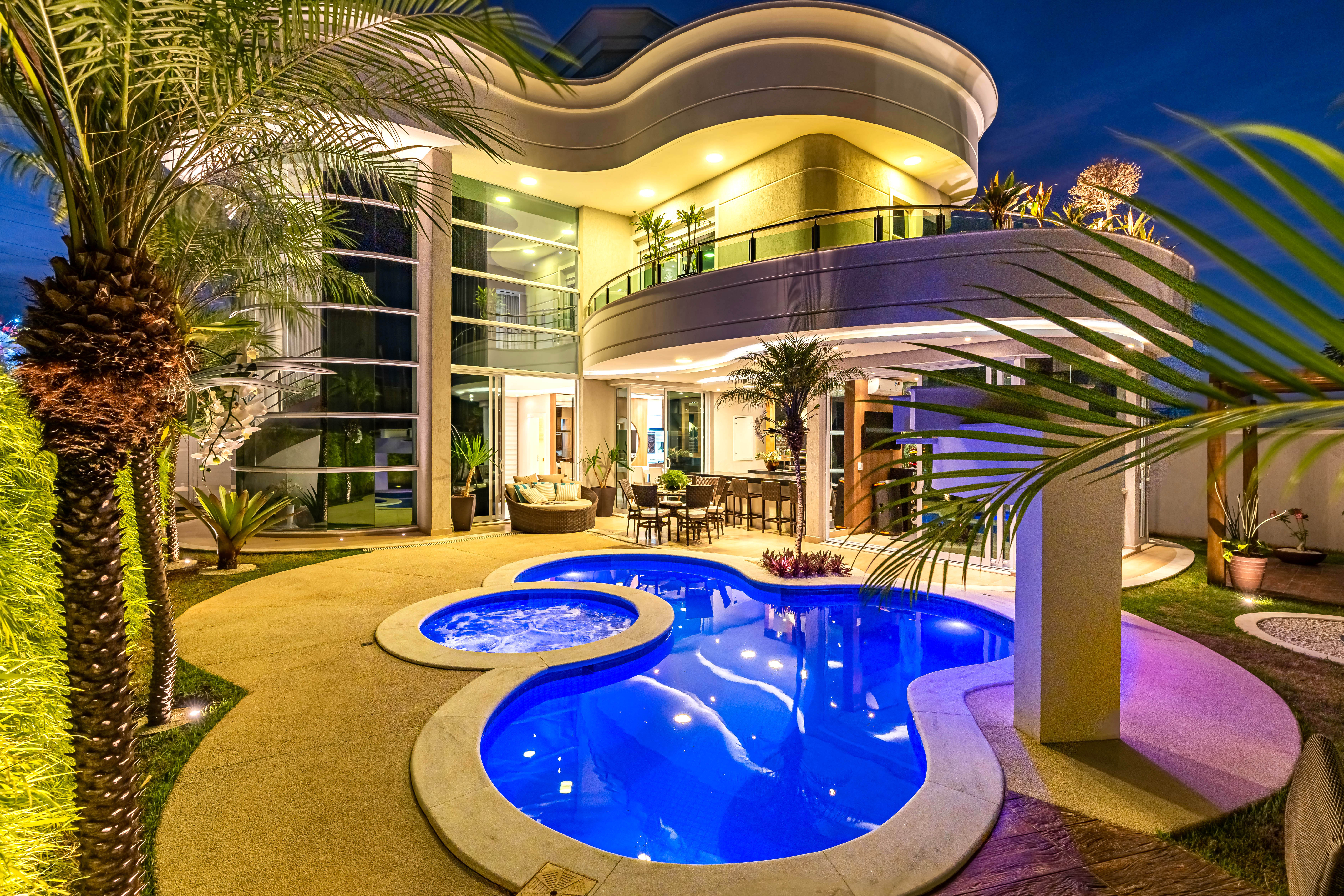 O lazer da Casa Green Park, assinada pelo arquiteto Aquiles Nícolas Kílaris, é completo e dos sonhos, idealizado para aproveitar momentos em família e com amigos. No espaço gourmet completo, mesa de refeição, bancada curva, churrasqueira e área de trabalho. O belo jardim com muitos cantinhos aconchegantes para o relaxamento recebeu sofás e poltronas, que se misturam ao pergolado, coqueiro, vasos de flores e muito verde.
