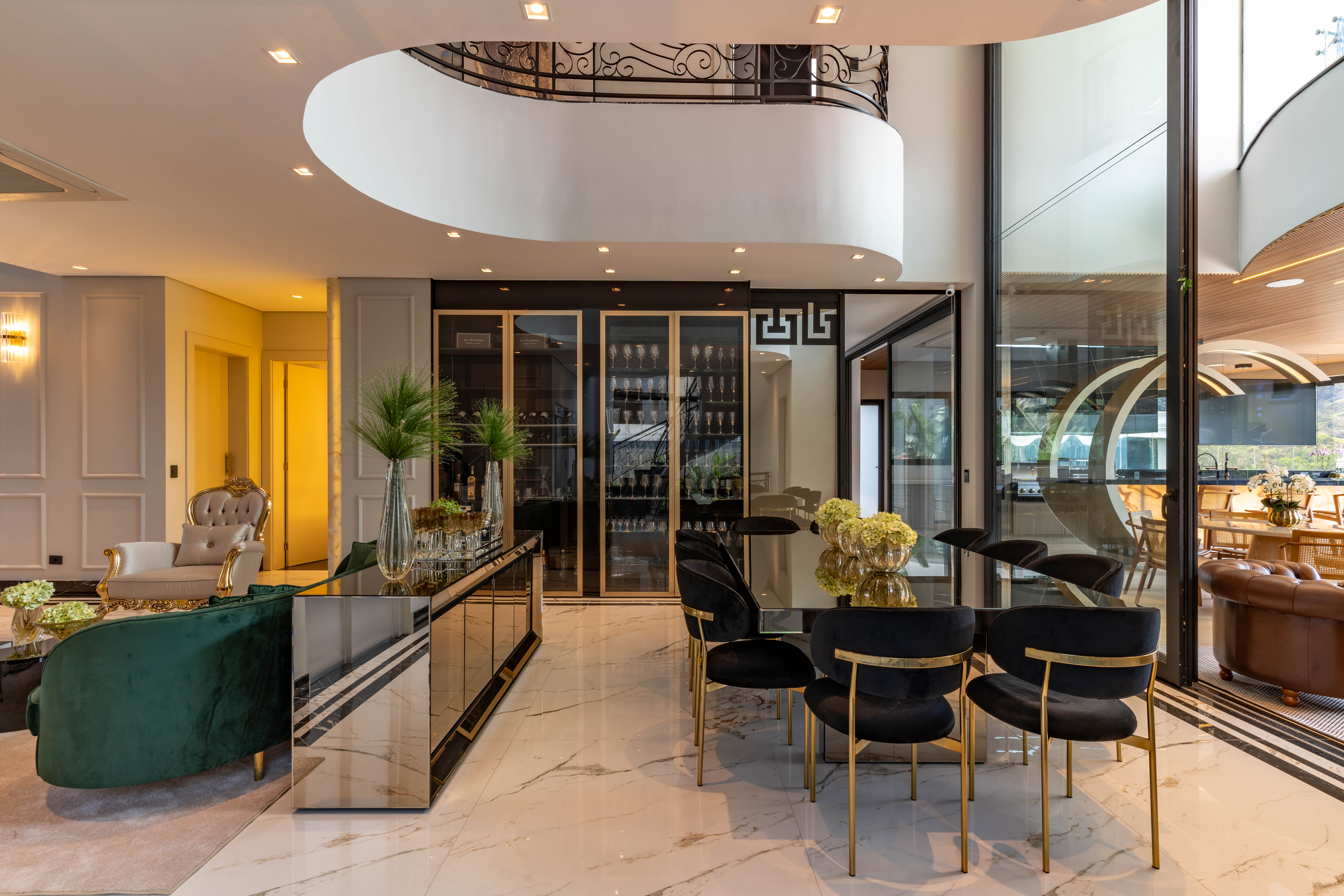 O interior contemporâneo da Casa Palazzo, assinado pela designer Iara Kílaris, totalmente integrado, permite a fluidez que conecta a sala de estar, a sala de jantar e a cozinha gourmet em um único espaço, localizados no térreo. Nele, foi projetado ainda, uma suíte. Materiais modernos como vidro, pedras e madeira concebem ambientes acolhedores e sofisticados. No pavimento superior, três suítes com varandas voltadas para a mata.