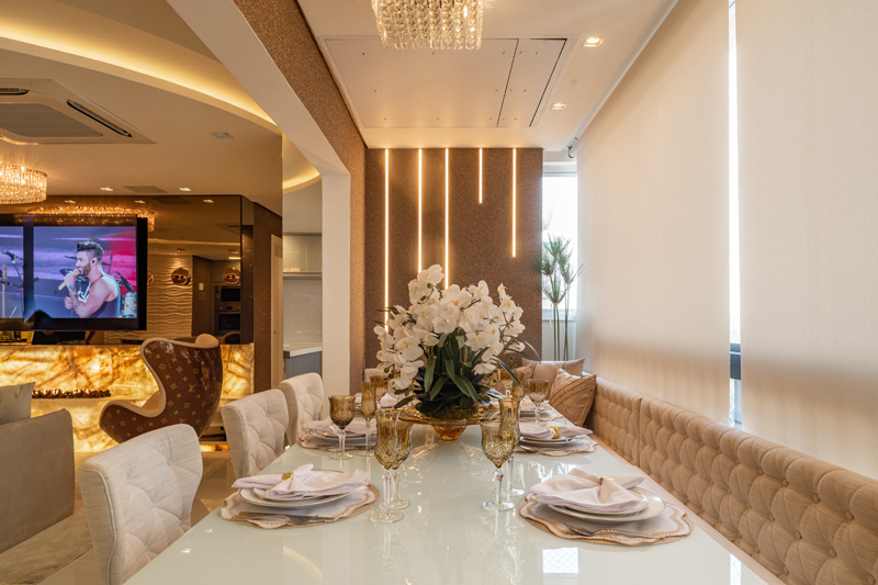 Por se tratar de um imóvel mais compacto, a varanda gourmet foi integrada à cozinha, recebendo uma única e grande bancada curva com cooktop, usada também para refeições rápidas. De um lado armários, torre para dois fornos e geladeira; de outro churrasqueira e chopeira. A sala de jantar foi ambientada na varanda, deixando assim mais espaço para o living.