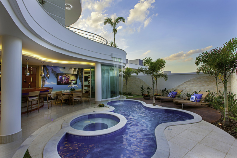 Construída em dois pavimentos, a parte térrea é completamente integrada. Living, jantar, home theater e cozinha dividem o mesmo espaço sem nenhuma porta ou parede. Todos estes espaços estão voltados para a área externa.
