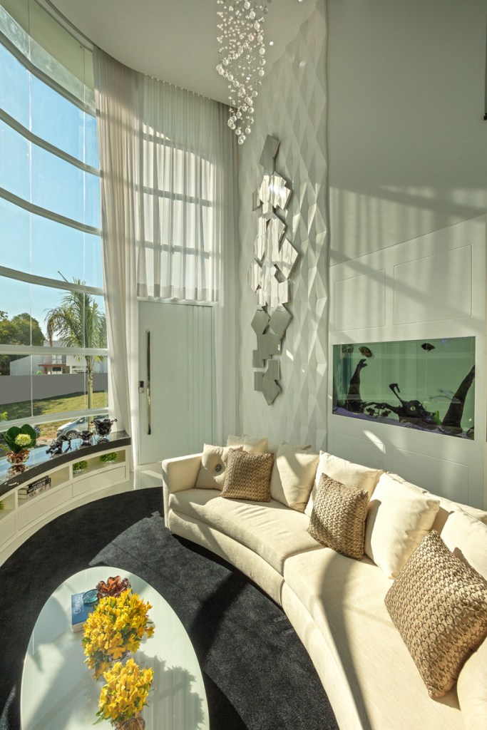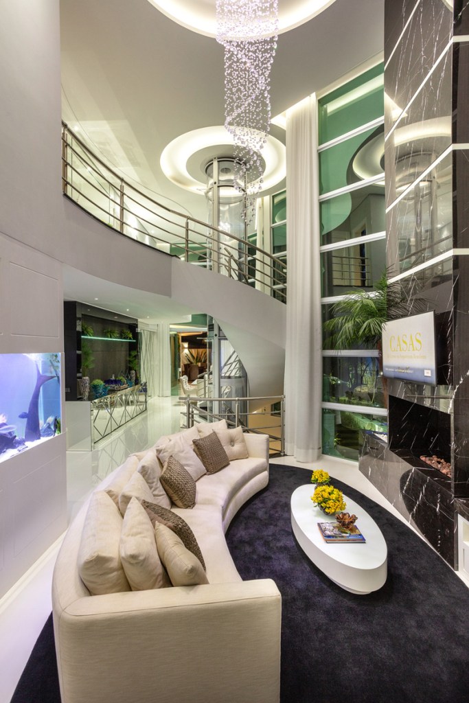 Todos os ambientes da Casa do Lago, assinada pelo arquiteto Aquiles Nícolas Kílaris, estão voltados para a mata e lago que fica em frente à casa. De qualquer ambiente em que se esteja é possível contemplar o pôr do sol. Na área social do térreo estão living, sala de jantar – ambos com decoração em branco e preto – brinquedoteca, lavabo, home theater e cozinha. No living, um painel de mármore acompanhando o pé direito duplo da do imóvel, recebeu lareira e TV.