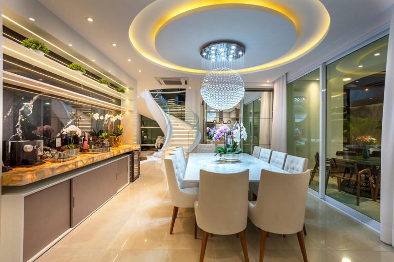 O buffet de apoio para auxiliar o serviço da sala de jantar ganhou a elegância de uma pedra iluminada, vários objetos de decoração em murano e prata e um cantinho especial para o café. Ele também reúne armários para organização de louças e adega para vinhos.