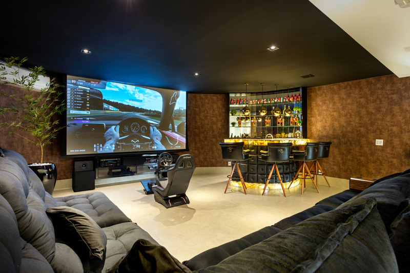 A garagem bar, no subsolo, além de acomodar os veículos da casa, ainda recebeu uma sala de estar multiuso com bar, onde é possível brincar com um grande game ou dar uma festa!