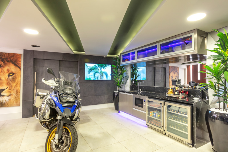 A garagem acomoda além dos carros, motos, que são o hobby do dono da casa. Lá também está localizado o ateliê de arte da dona da casa, escritório e uma sala de cinema supercompleto e confortável. Como apoio, banheiro, pequeno bar e forno.