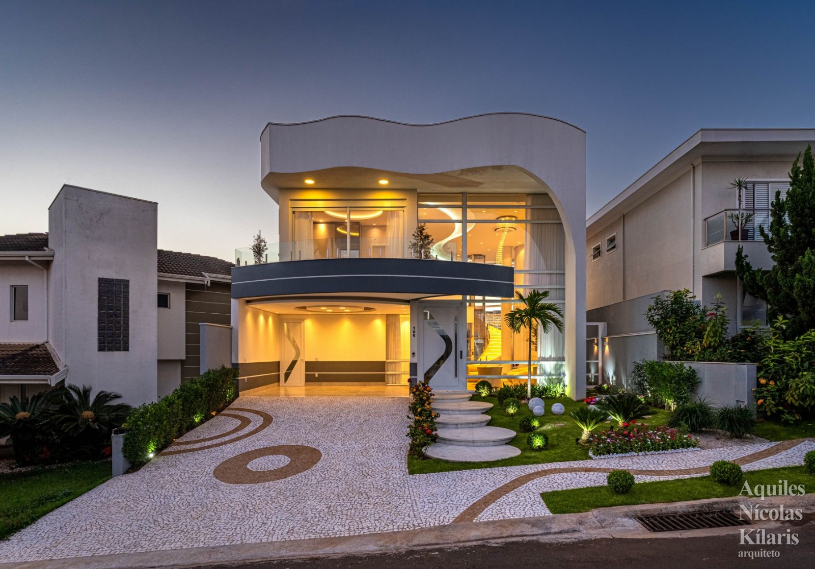 Formas esculturais e linguagem contemporânea. Essa é a melhor definição para a Casa Metropolitan assinada pelo arquiteto Aquiles Nícolas Kílaris, em Paulínia. Com 331 m² de área construída, possui fachada com um pilar marcante que sobe até uma testeira repleta de curvas. Outro elemento sinuoso nasce na laje da garagem e atravessa parte da fachada, reforçando o caráter plástico da arquitetura.