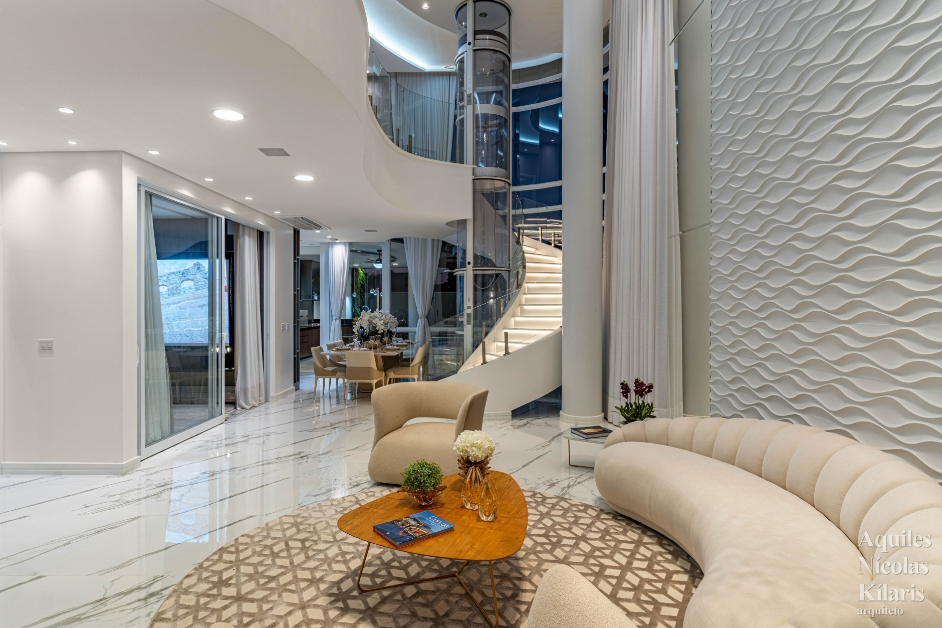 A decoração segue uma proposta clean e contemporânea, com predominância de tons claros e elementos brancos. A cozinha em branco e preto é integrada ao jantar com vista o lazer. O home theater, no térreo, foi concebido como sala de cinema.