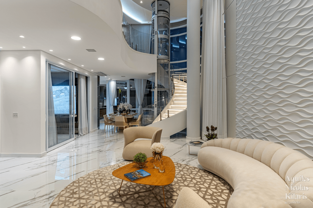 O pé-direito duplo da Casa Metropolitan abriga o living e a sala de jantar, integrados no pavimento térreo. A escada se apresenta como elemento arquitetônico de destaque, proporcionando um verdadeiro passeio arquitetônico, no qual o cenário se transforma à medida que vamos percorrendo seus degraus. Ao seu lado o elevador, que garante conforto e acessibilidade.