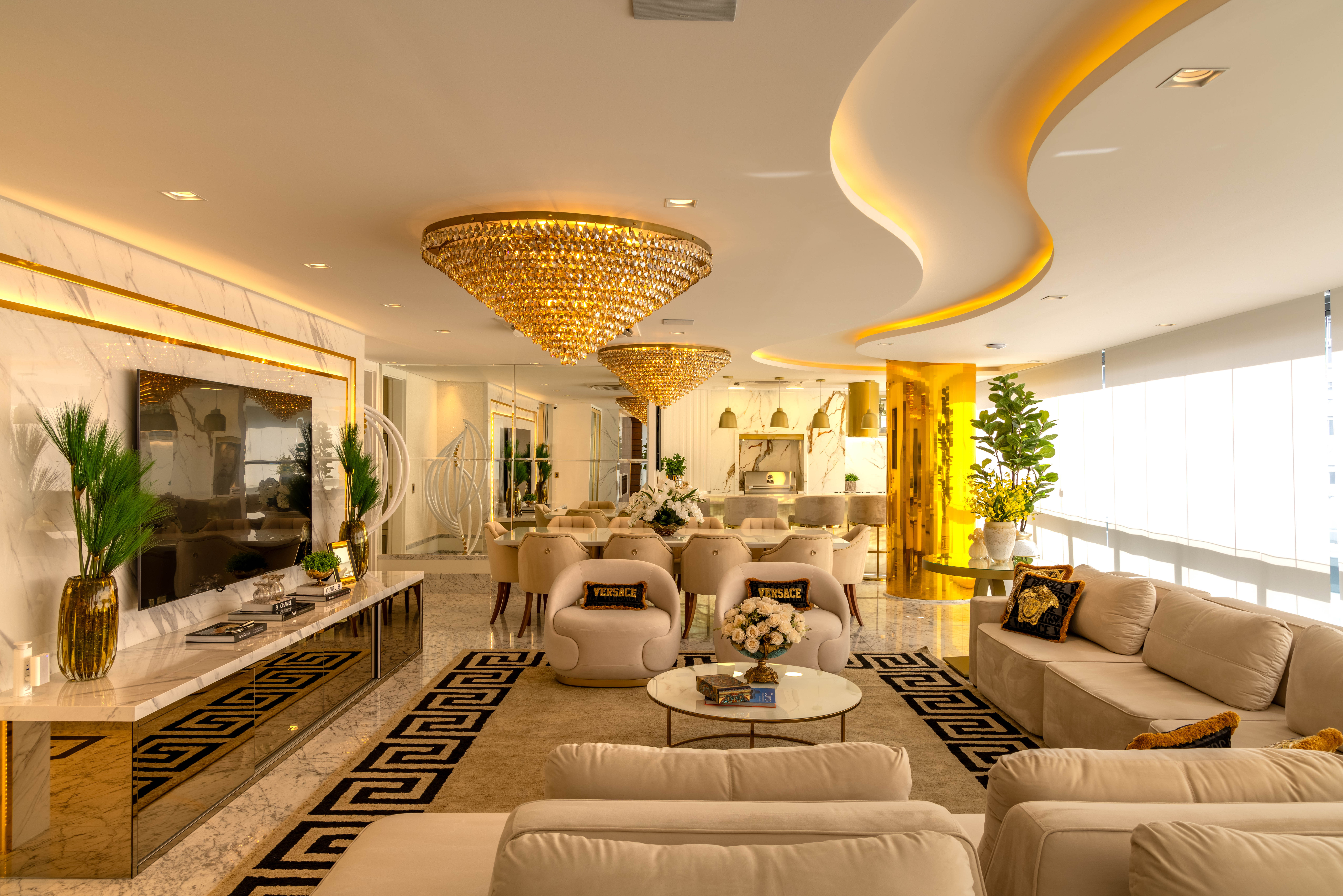 No Apartamento Fasano, o living com lareira, a área de jantar e o espaço gourmet estão unidos em um único ambiente, onde predominam as cores branco e dourado. O dourado, inclusive, aparece como revestimento na coluna estrutural desses ambientes, acrescentando um toque de elegância.