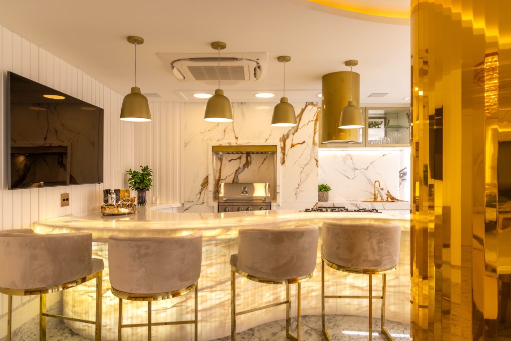 O living com lareira, a área de jantar e o espaço gourmet estão unidos em um único ambiente, onde predominam as cores branco e dourado. O dourado, inclusive, aparece como revestimento na coluna estrutural desses ambientes, acrescentando um toque de elegância.